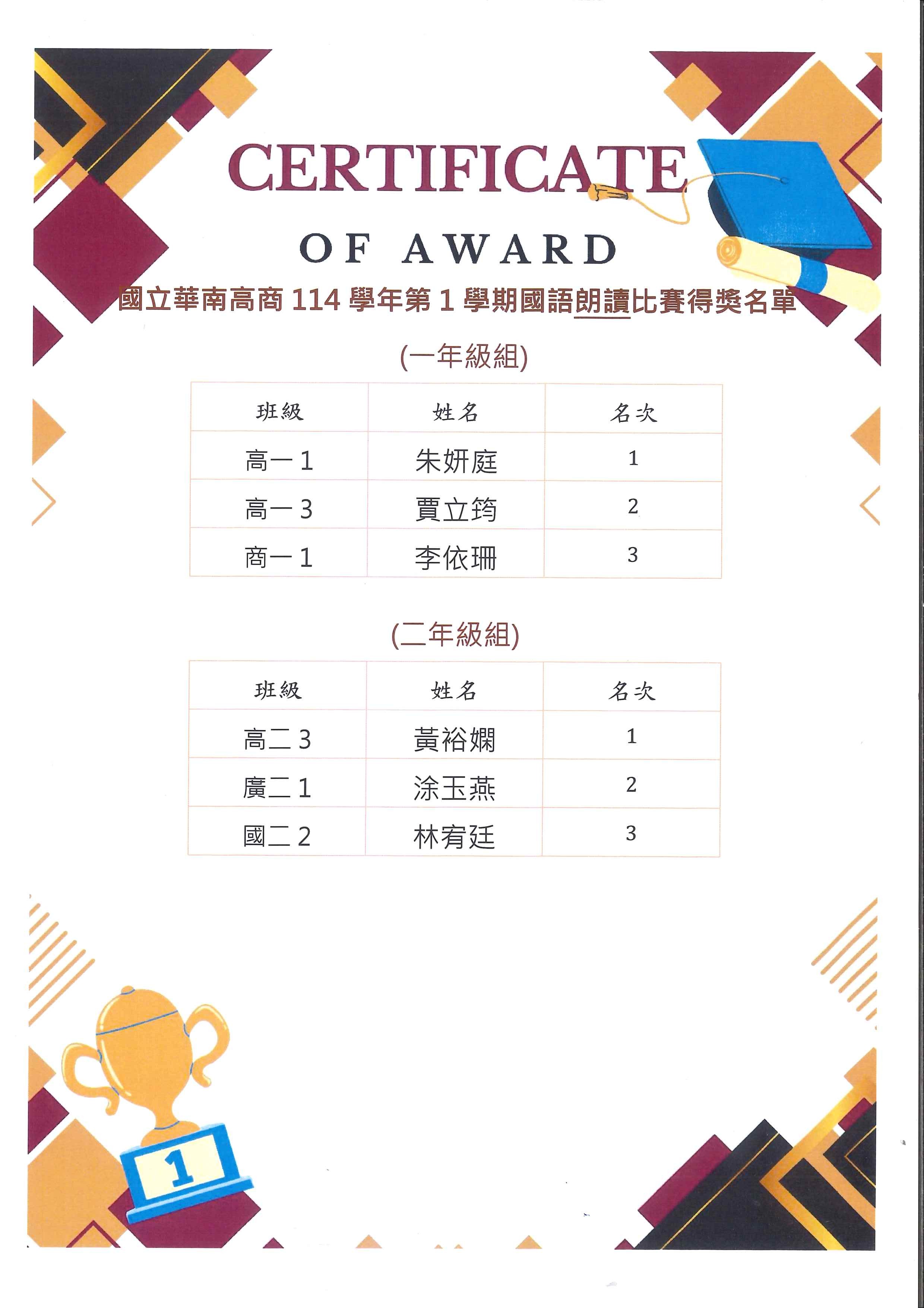 本校114學年第1學期國語朗讀比賽得獎名單,恭喜獲獎同學!