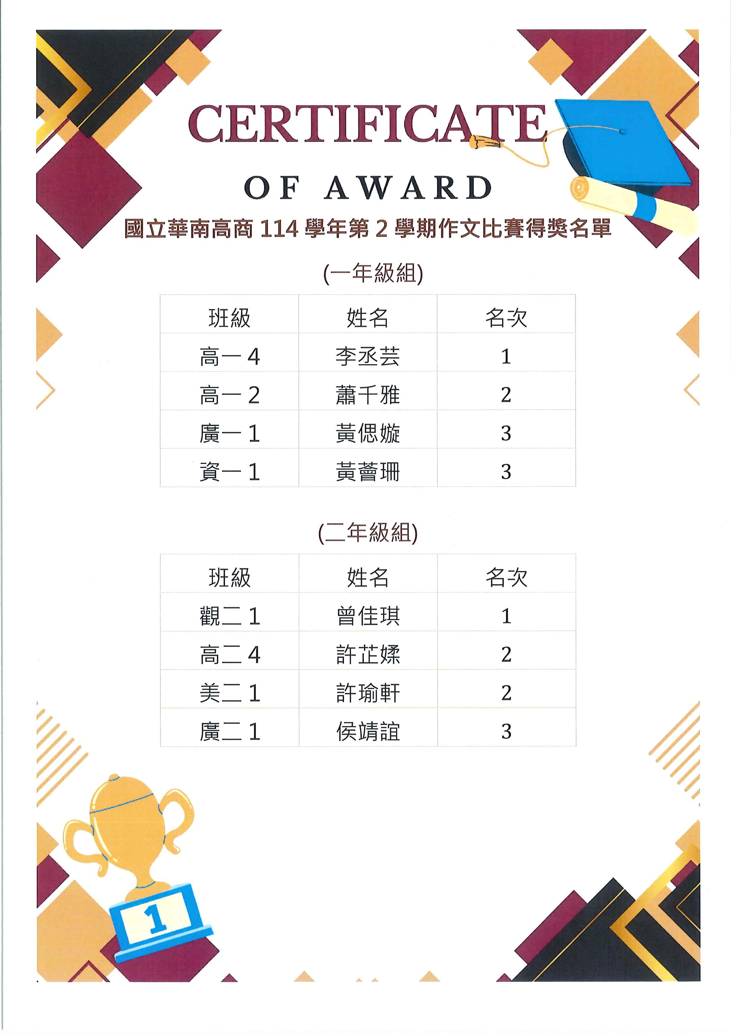 本校114學年第2學期作文比賽得獎名單