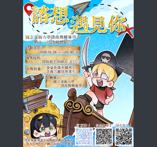 歡迎對心理、輔導與助人工作有興趣的同學踴躍報名,一起「諮想遇見」不一樣的自己!💬