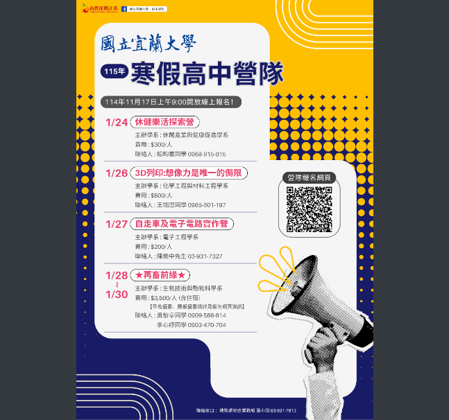國立宜蘭大學將於 115 年寒假期間辦理多項高中主題營隊,內容涵蓋各系特色課程與體驗活動,協助學生提前認識大學環境與學系方向,歡迎有興趣的同學參加。