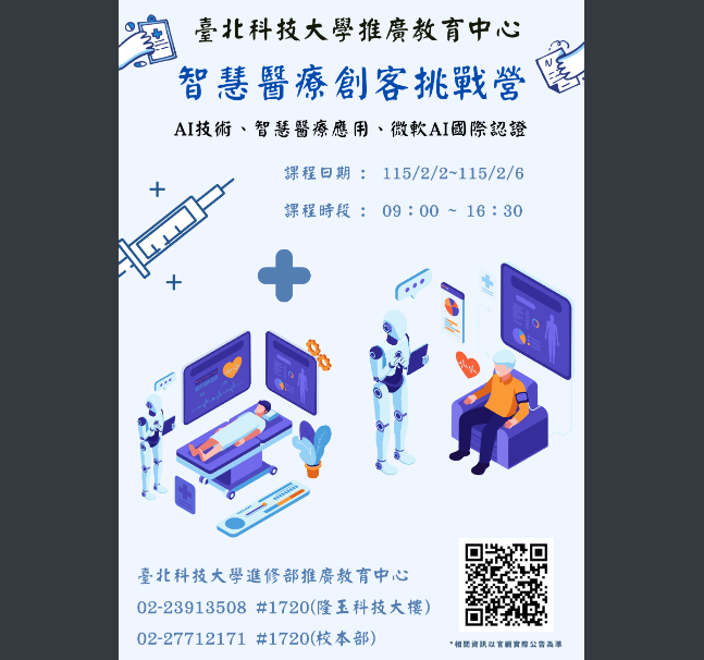 公告國立臺北科技大學進修部推廣教育中心辦理「智慧醫療創客挑戰營」活動訊息。本營隊結合智慧科技與醫療創新,內容具互動性與實作性,歡迎有興趣的同學踴躍參加。