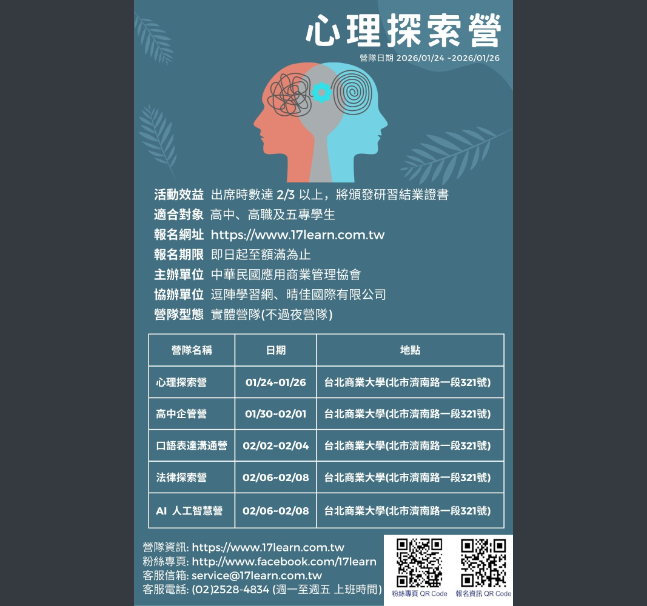 社團法人中華民國應用商業管理協會主辦「心理探索營-2026冬令營」,