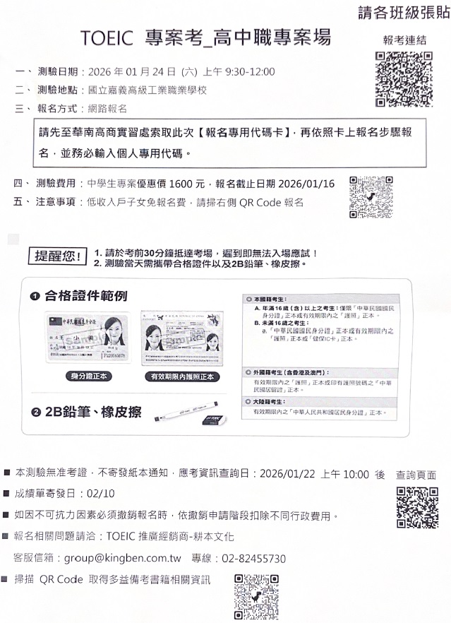 欲報考同學請先至應英科主任辦公室索取「報名專用代碼卡」,以享優惠價格。