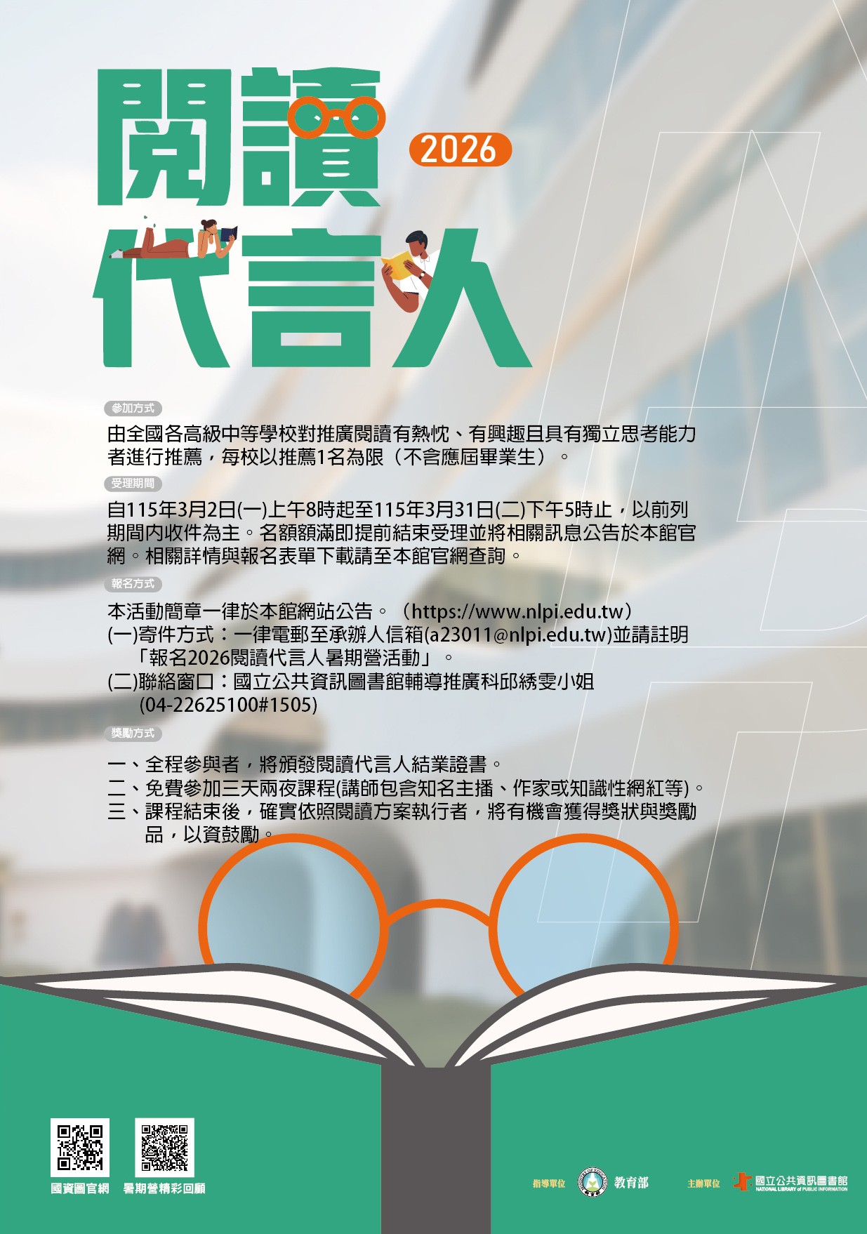 轉知國立公共資訊圖書館辨理2026「閱讀代言人」暑期營活動簡章(含報 名活動表單)與海報各1份,敬請貴校踴躍推薦學生參 加,並惠予公布於貴校網站協助宣傳,請查照