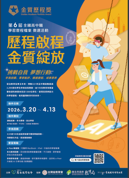 為鼓勵高中職學生整理並展現自己的學習軌跡,臺灣省教育會與社團法人慧治教育協會共同舉辦 第六屆「金質歷程獎」全國高中職學習歷程檔案徵選活動,透過徵選與回饋機制,協助學生掌握學習歷程檔案的製作重點,深化反思能力,並為升學與自我探索累積珍貴經驗,歡迎有興趣的同學踴躍參與。
