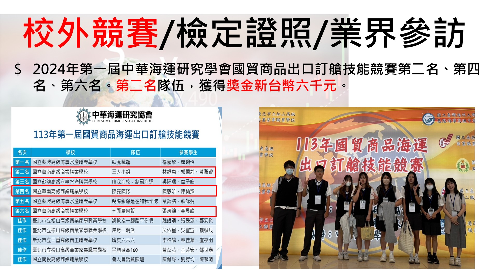 - 重視實務技能:重視國貿專業實務技能,如輔導學生取得會計事務、軟體應用、中文輸入、英文輸入等各種檢定及國際貿易大會考等技能檢定合格証書。