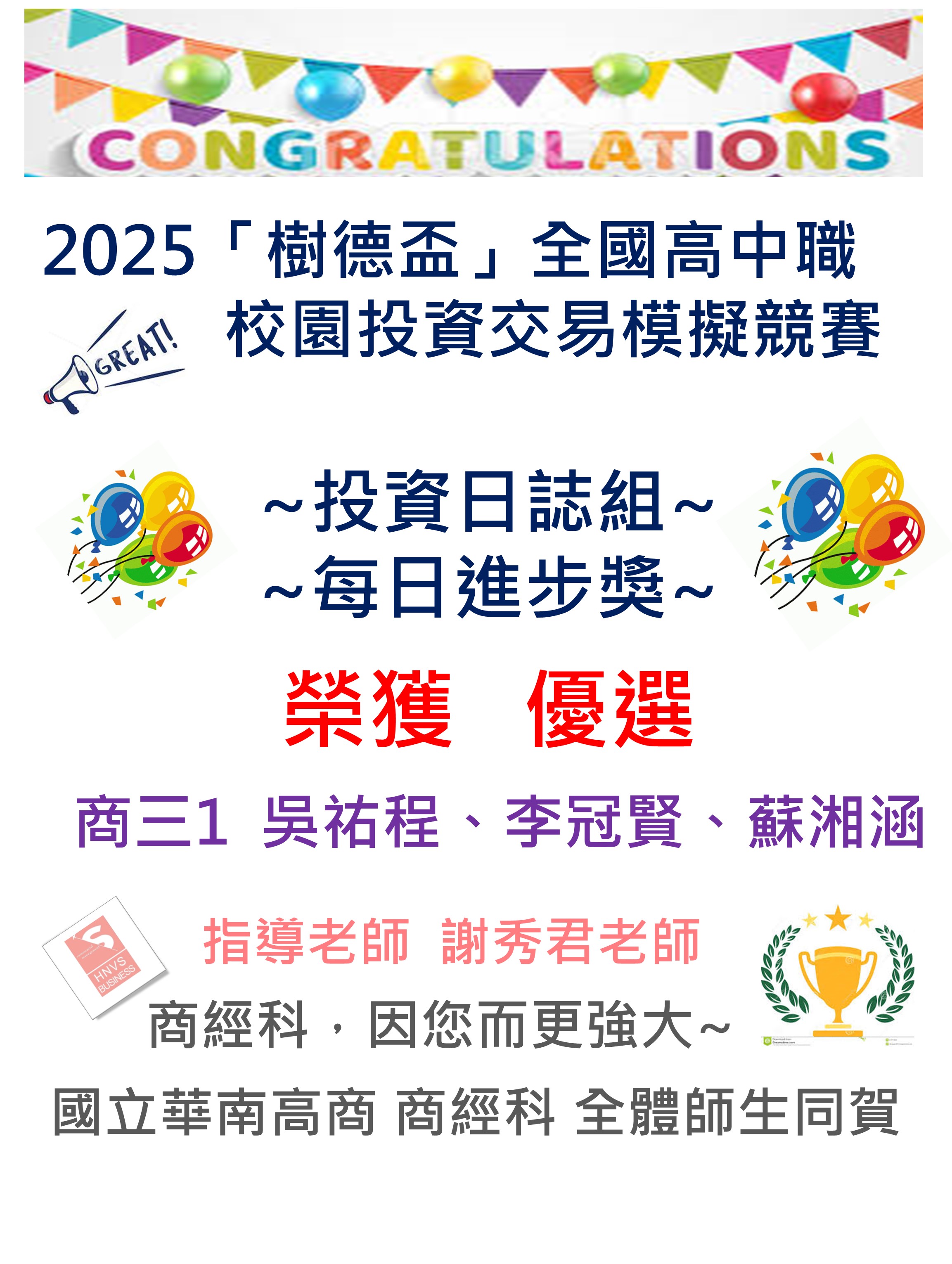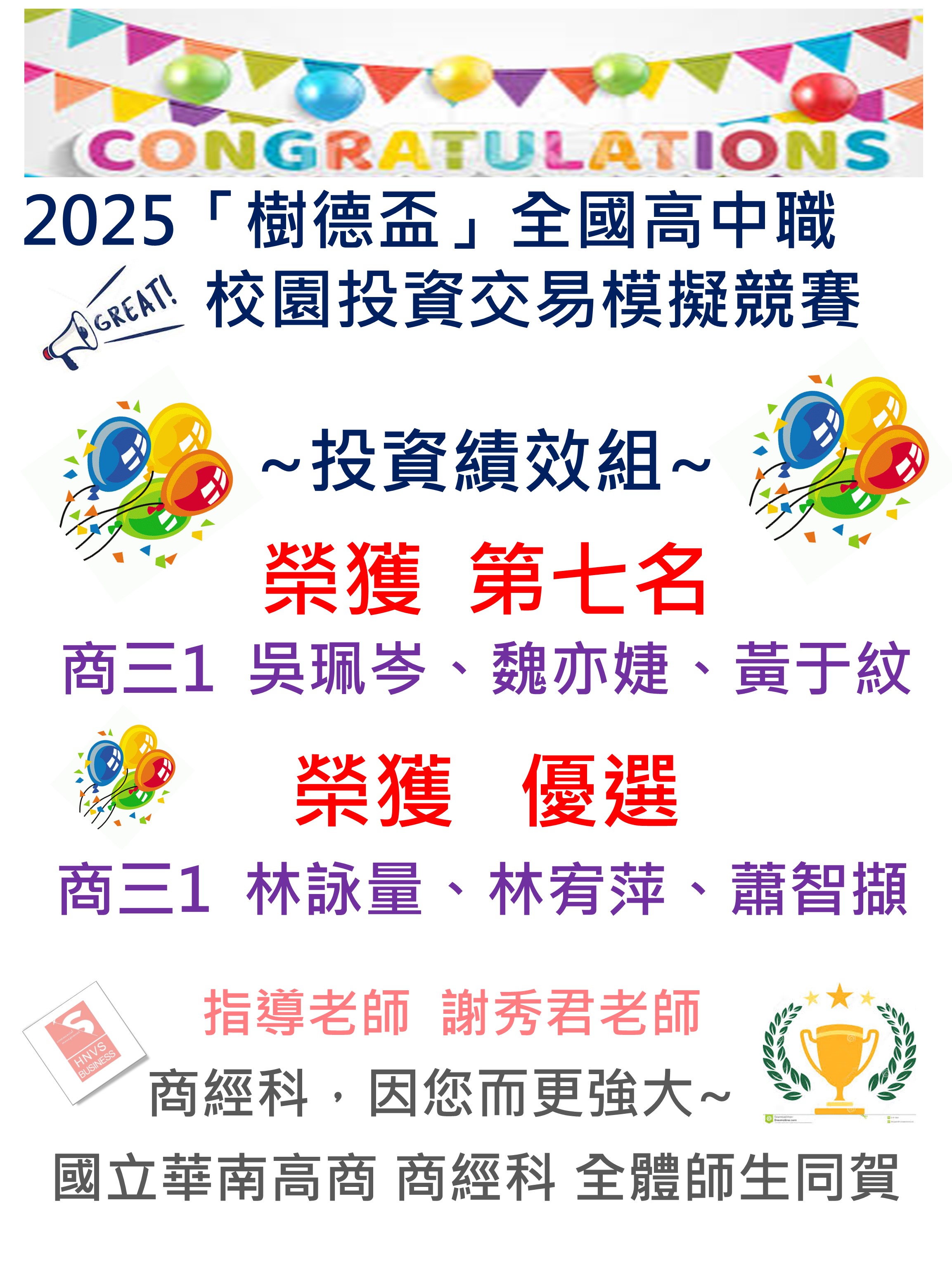 國立華南高商 商經科 全體師生同賀
