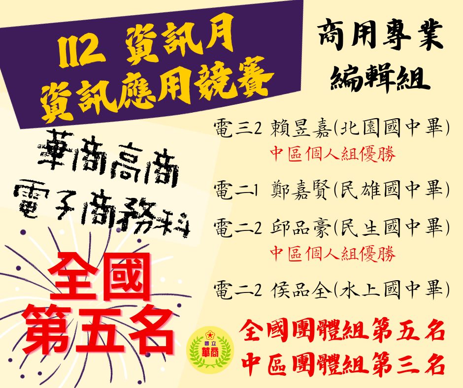 賀~電商科112資訊月資訊應用技能競賽榮獲全國第五名