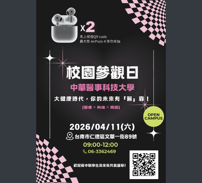 中華醫事科技大學辦理校園參觀活動,透過科系介紹與實際教室體驗,帶領同學深入認識醫事與健康相關領域,提前探索升學方向與未來職涯發展,歡迎有興趣的同學、師長與家長踴躍參加!