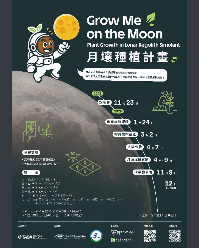 國家太空中心「Grow Me on the Moon-月壤種植」活動報名即日起至2026年3月2日止,歡迎有興趣的同學參與。