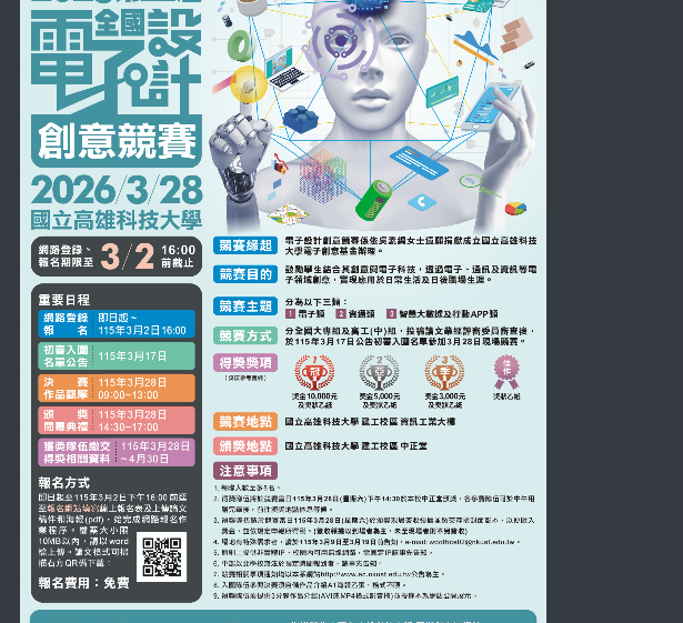 轉知:國立高雄科技大學「2026年第二十二屆全國電子設計創意競賽」