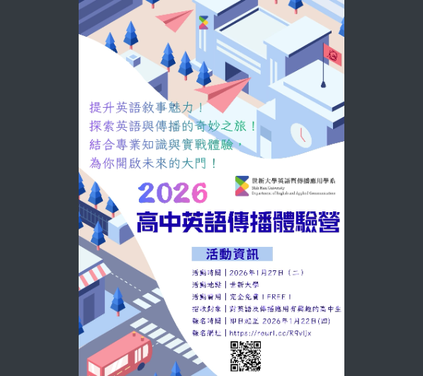 歡迎對英語傳播、媒體應用有興趣的同學踴躍報名參加,詳細資訊請參閱活動簡章。