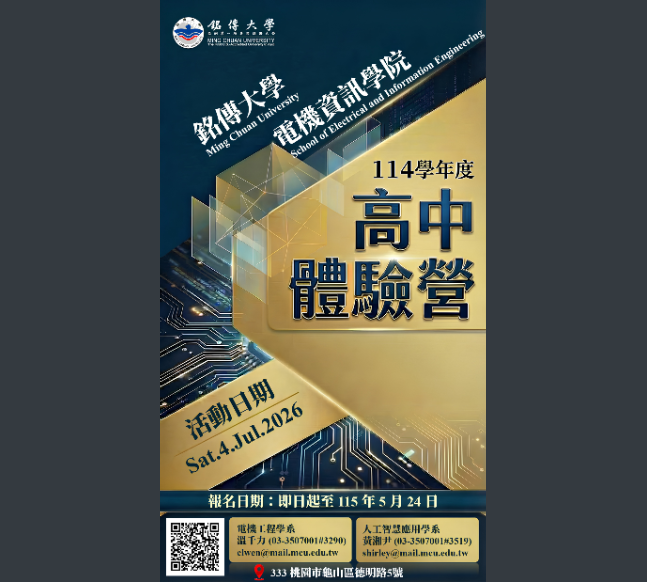 銘傳大學電機資訊學院辦理高中體驗營,透過實作與課程體驗,帶領同學認識人工智慧與電機工程領域的學習內容與應用發展,讓你提前接觸科技趨勢,探索未來升學方向!