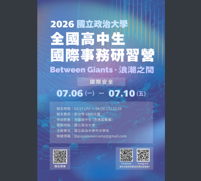 國立政治大學外交學系舉辦「全國高中生國際事務研習營」,透過專業課程、參訪與多元活動,帶領同學深入認識國際關係與外交領域,拓展國際視野,探索未來升學與發展方向,歡迎有興趣的同學踴躍報名參加!